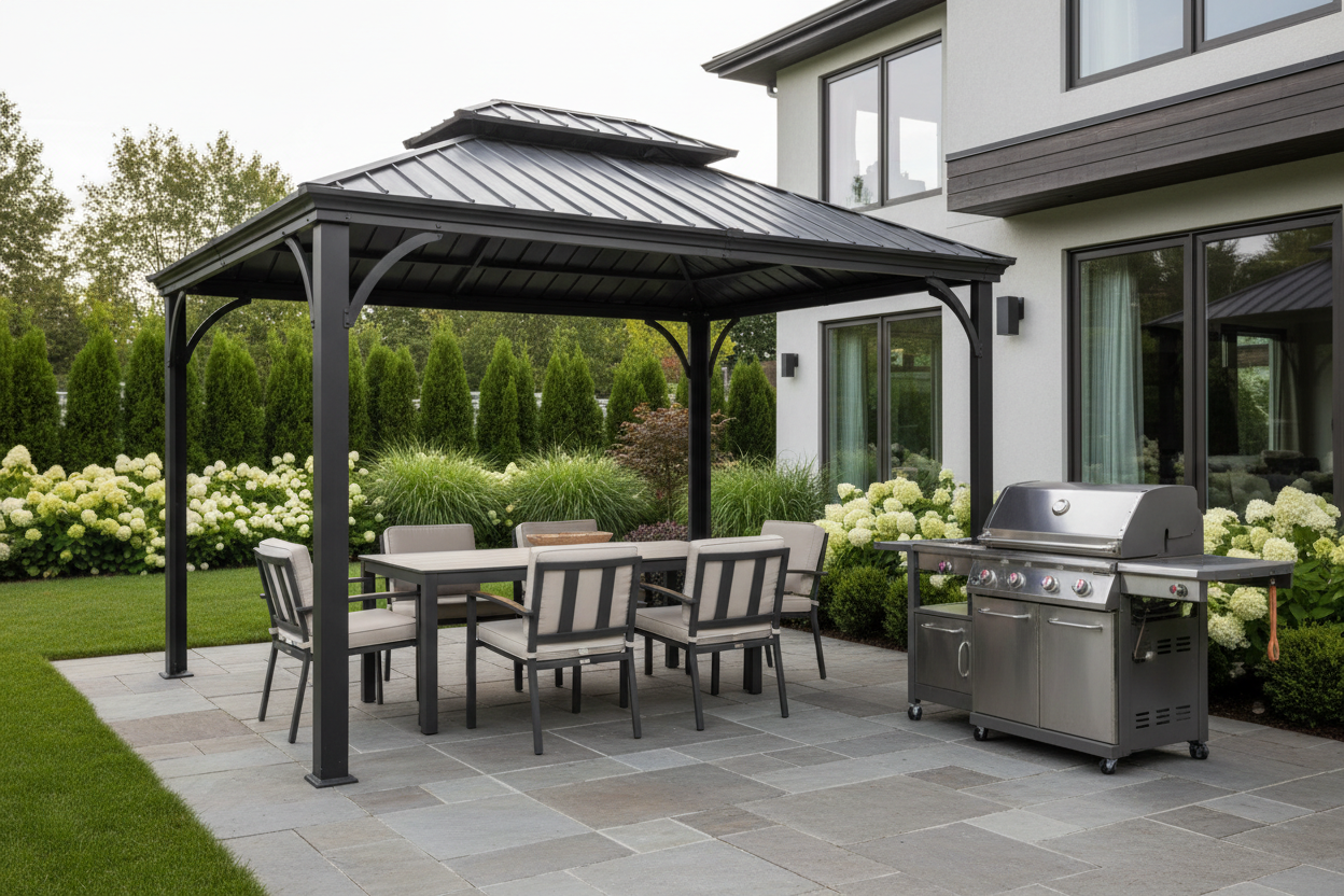With clean lines and a modern silhouette, it creates a comfortable retreat that softens sunlight and defines the patio with quiet sophistication. It invites relaxation, offering a balance of openness and shelter that enhances any outdoor moment.