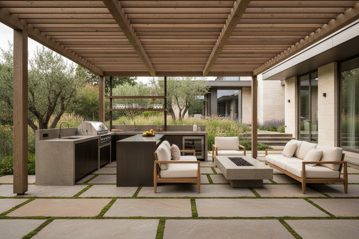 Warm daylight settles across a refined patio, creating a calm space where gatherings unfold naturally and the outdoors feels effortlessly inviting.